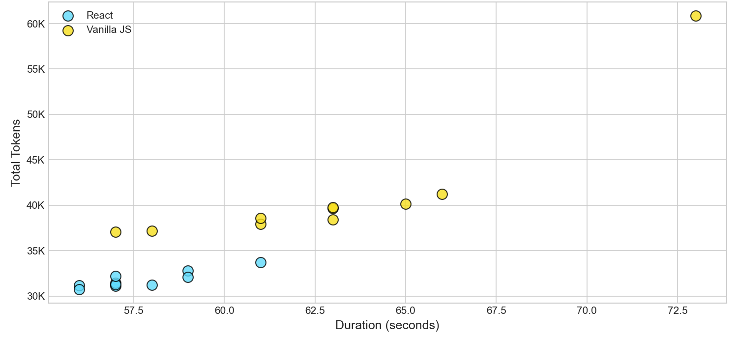 Beyond the averages, React was remarkably more consistent: its duration varied by only 1.6 seconds across runs, compared to 4.7 seconds for Vanilla JS—meaning React delivers not just better performance, but more predictable performance.