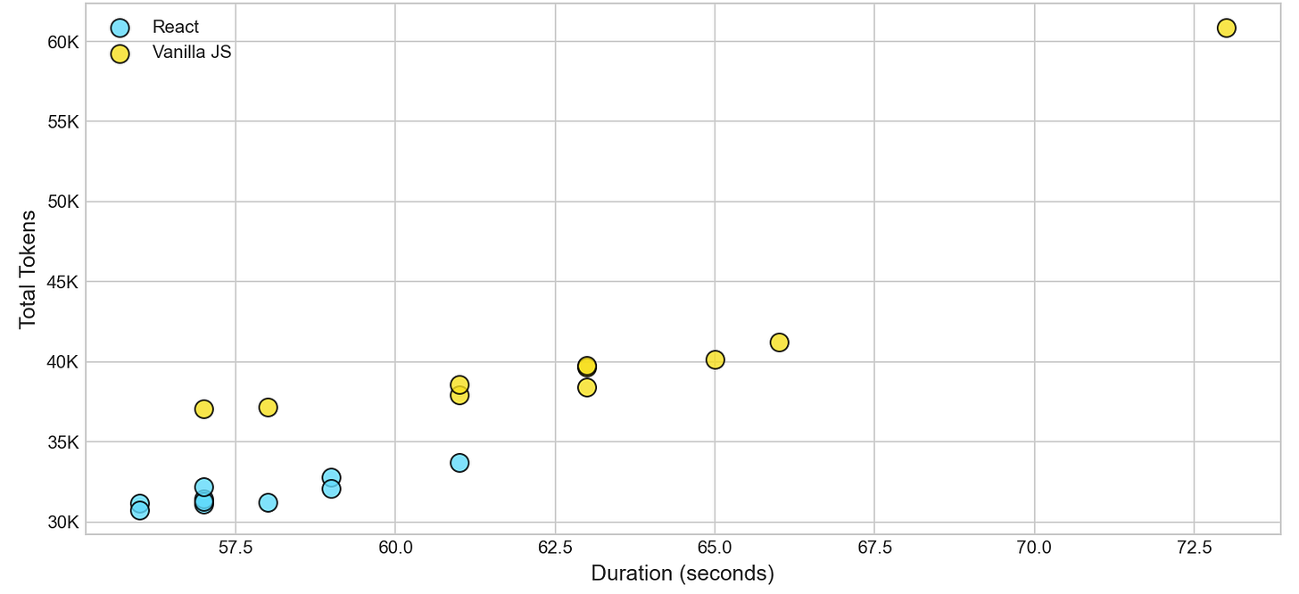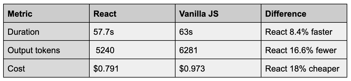 React expresses the same application logic in fewer tokens. The model does the same amount of thinking but produces less text, which could also explain why it is quicker. In a pay-per-token world, that’s a difference that matters.